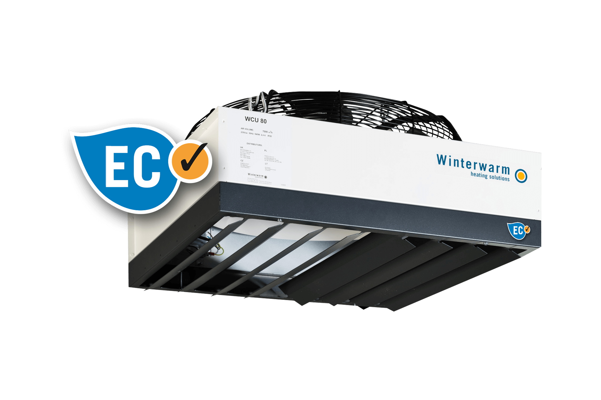 Every WCU-EC unit is fitted with a thermostat which ensures that warm air from the ceiling will be pushed to floor level. In general WCU-EC units can save easily approx. 30% of the energy used for heating. Additionally the electricity consumption of the EC fan itself is about 25% electricity less compared to the standard WCU units. The EC fan allows the unit to be controlled by a stepless 0-10 Volt controller. Besides that, the WCU-EC is low noise.